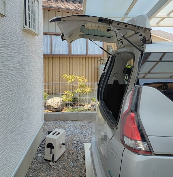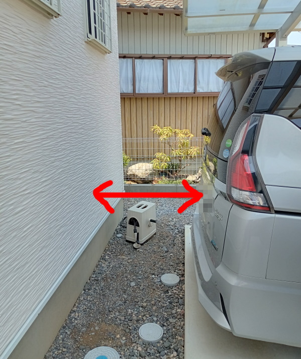 全長4,770mmのセレナ(C27型)を我が家の駐車スペースに停めると、リアゲートと家の外壁のとの間は、約85cmしかありません。