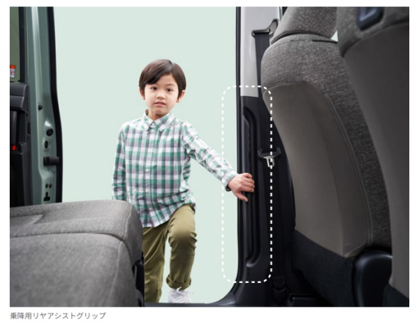 この乗降用リヤアシストグリップは、小さい子供でも手の届く、低い高さまで伸びているため、2歳~4歳児のお子様でも、自力で乗り込めます。